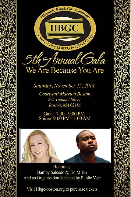 BOSTON, Mass.—The Hispanic Black Gay Coalition (HBGC) will host its annual gala and soiree on Saturday, November 15, from 7:30 p.m. to 1:00 a.m. at the Courtyard Marriott located at 275 Tremont Street in Boston, MA. The community-oriented celebration will mark five years for the organization, which started as a grassroots response to the lack of visibility, resources, and services for Black, Hispanic, and Latin@ LGBTQ individuals in the Greater Boston area.