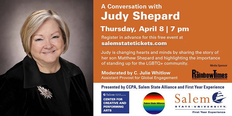 Judy Shepard will speak about her son Matthew’s story and her work as an LGBTQIA activist in a free virtual event on April 8 at 7 pm. Tickets for The Laramie Project are $10 general/free for students. Reservations for both events at www.salemstatetickets.com. Co-sponsored by the Salem State University Alliance. Note: The Laramie Project is intended for mature audiences.